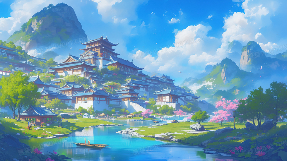 本作品内容为蓝天白云绿树建筑风景插画, 格式为 jpg, 大小4 MB, 图片尺寸为2912 x 1632, 源文件无水印, 欢迎使用熊猫办公。 如认为平台内容涉嫌侵权,可通过邮件:tousu@tukuppt.com提出书面通知,我们将及时处理。