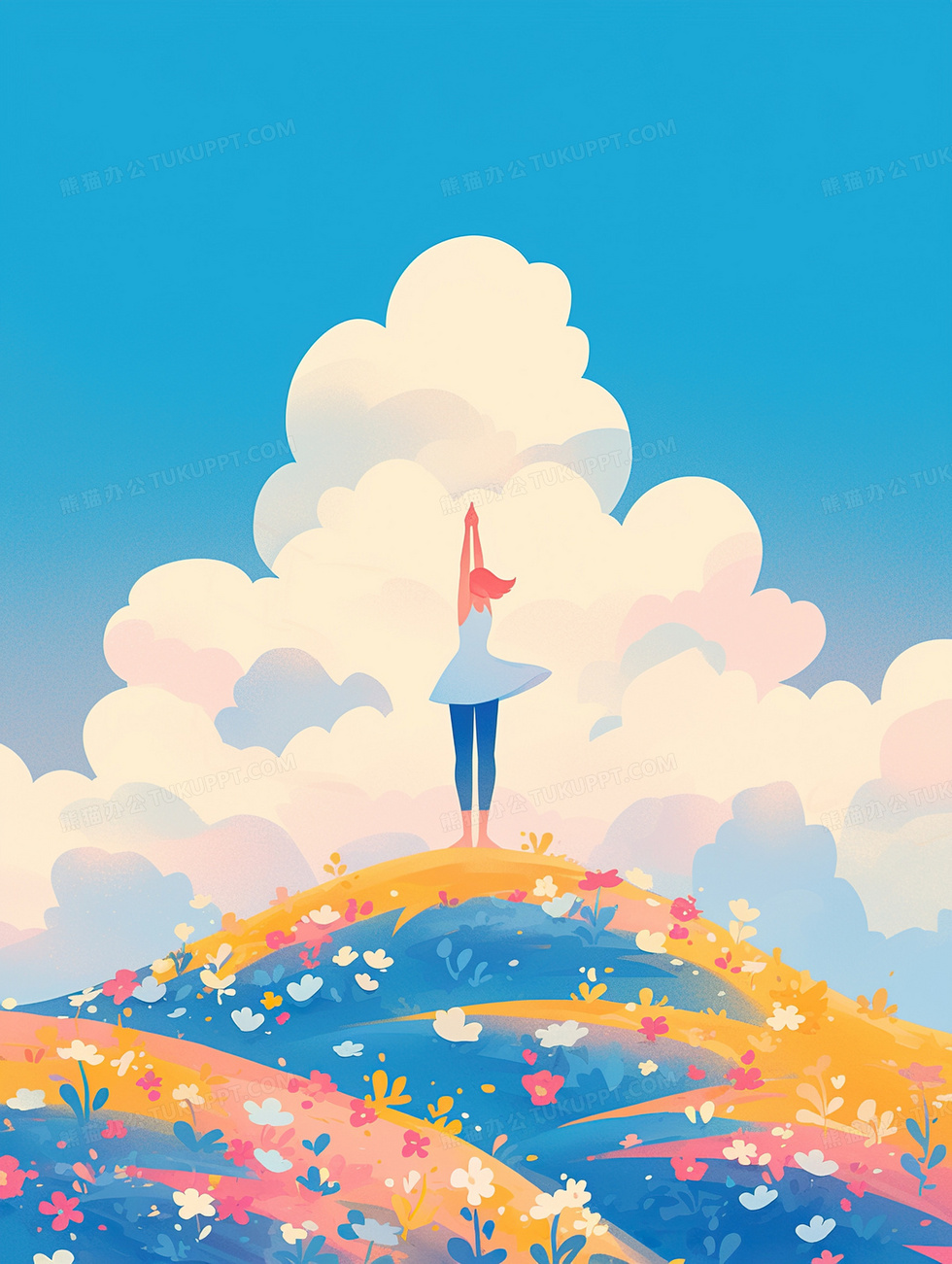 本作品内容为蓝天白云在花丛中做瑜伽插画, 格式为 jpg, 大小3 MB, 图片尺寸为1856 x 2464, 源文件无水印, 欢迎使用熊猫办公。 如认为平台内容涉嫌侵权,可通过邮件:tousu@tukuppt.com提出书面通知,我们将及时处理。