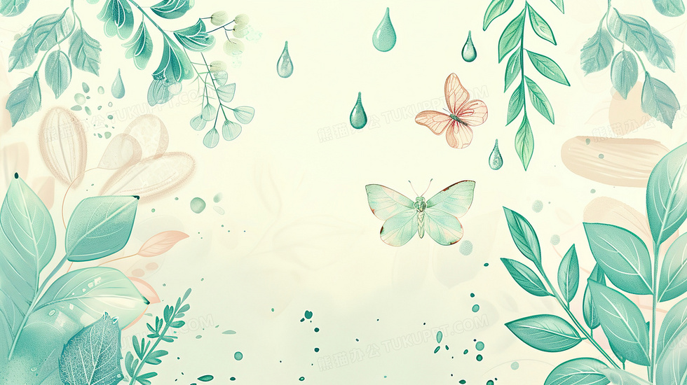 本作品内容为绿色手绘小清新植物蝴蝶装饰背景, 格式为 jpg, 大小3 MB, 图片尺寸为2912 x 1632, 作品中背景图片无需修改, 源文件无水印,可以直接使用, 欢迎使用熊猫办公。 如认为平台内容涉嫌侵权,可通过邮件:tousu@tukuppt.com提出书面通知,我们将及时处理。