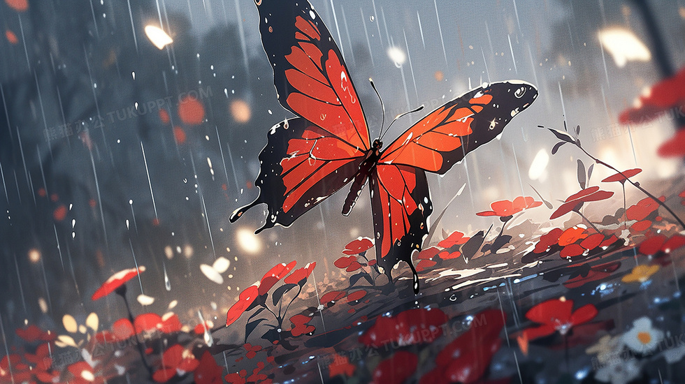 本作品内容为雨中红色花间飞舞的红色蝴蝶插画, 格式为 jpg, 大小4 MB, 图片尺寸为2912 x 1632, 源文件无水印, 欢迎使用熊猫办公。 如认为平台内容涉嫌侵权,可通过邮件:tousu@tukuppt.com提出书面通知,我们将及时处理。
