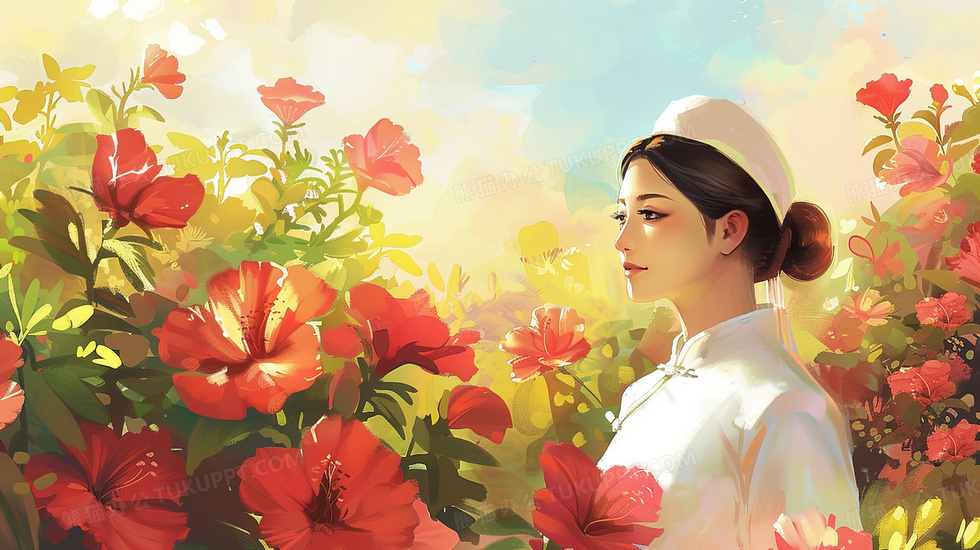 本作品内容为站在花丛中的护士插画, 格式为 jpg, 大小3 MB, 图片尺寸为2912 x 1632, 源文件无水印, 欢迎使用熊猫办公。 如认为平台内容涉嫌侵权,可通过邮件:tousu@tukuppt.com提出书面通知,我们将及时处理。