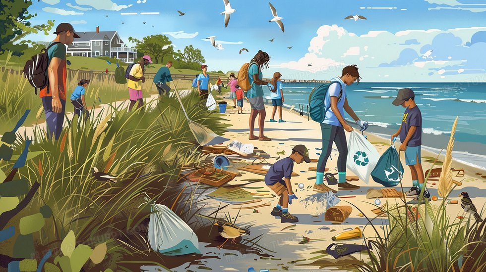 海滩上收拾垃圾的人们插画