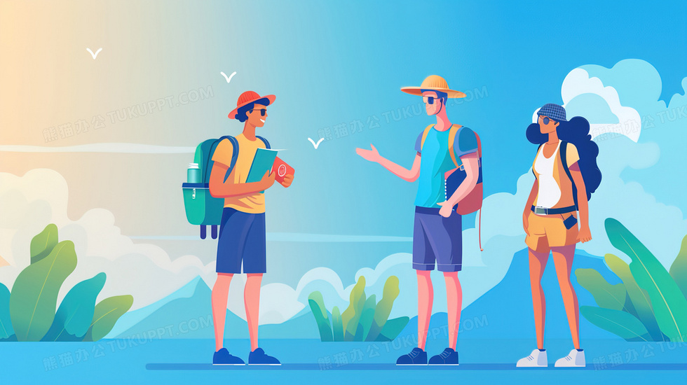 本作品内容为夏季度假旅游的年轻人插画, 格式为 jpg, 大小2 MB, 图片尺寸为2912 x 1632, 源文件无水印, 欢迎使用熊猫办公。 如认为平台内容涉嫌侵权,可通过邮件:tousu@tukuppt.com提出书面通知,我们将及时处理。