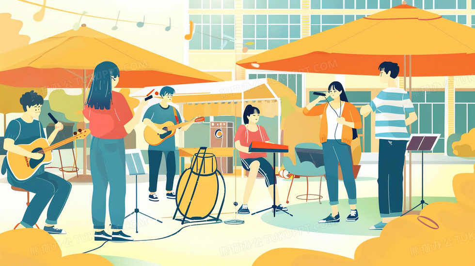 本作品内容为参加音乐社团活动的年轻人插画, 格式为 jpg, 大小3 MB, 图片尺寸为2912 x 1632, 源文件无水印, 欢迎使用熊猫办公。 如认为平台内容涉嫌侵权,可通过邮件:tousu@tukuppt.com提出书面通知,我们将及时处理。