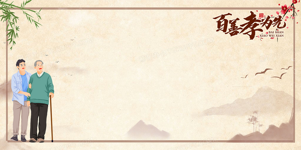 本作品内容为百善孝为先中国风孝道边框背景, 格式为 psd, 大小32 MB, 图片尺寸为4724 x 2362, 作品中背景图片无需修改, 源文件无水印,可以直接使用, 欢迎使用熊猫办公。 如认为平台内容涉嫌侵权,可通过邮件:tousu@tukuppt.com提出书面通知,我们将及时处理。