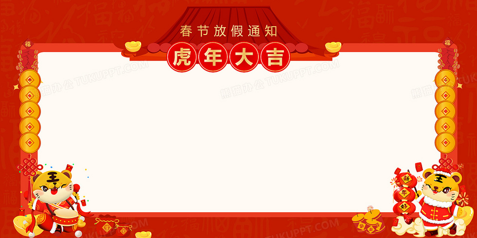 本作品内容为红色简约大气2022年虎年春节放假通知, 格式为 psd, 大小30 MB, 图片尺寸为7087 x 3543, 作品中背景图片无需修改, 源文件无水印,可以直接使用, 欢迎使用熊猫办公。 如认为平台内容涉嫌侵权,可通过邮件:tousu@tukuppt.com提出书面通知,我们将及时处理。