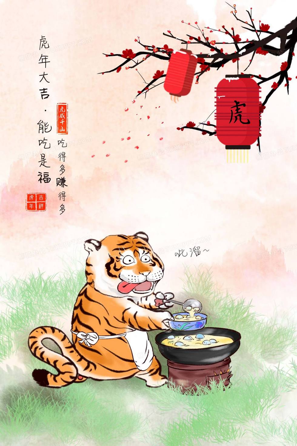 本作品内容为虎年水墨风趣味能吃是福老虎插画背景, 格式为 psd, 大小70 MB, 图片尺寸为2362 x 3543, 作品中背景图片无需修改, 源文件无水印,可以直接使用, 欢迎使用熊猫办公。 如认为平台内容涉嫌侵权,可通过邮件:tousu@tukuppt.com提出书面通知,我们将及时处理。