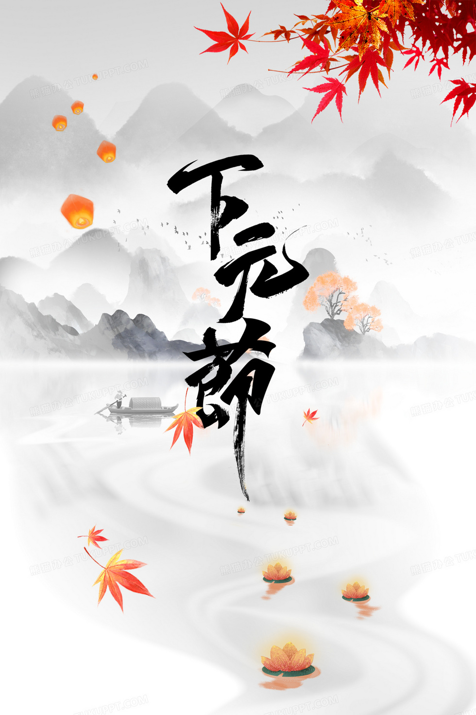 本作品内容为下元节山水枫灯情背景, 格式为 psd, 大小81 MB, 图片尺寸为3543 x 5314, 作品中背景图片无需修改, 源文件无水印,可以直接使用, 欢迎使用熊猫办公。 如认为平台内容涉嫌侵权,可通过邮件:tousu@tukuppt.com提出书面通知,我们将及时处理。