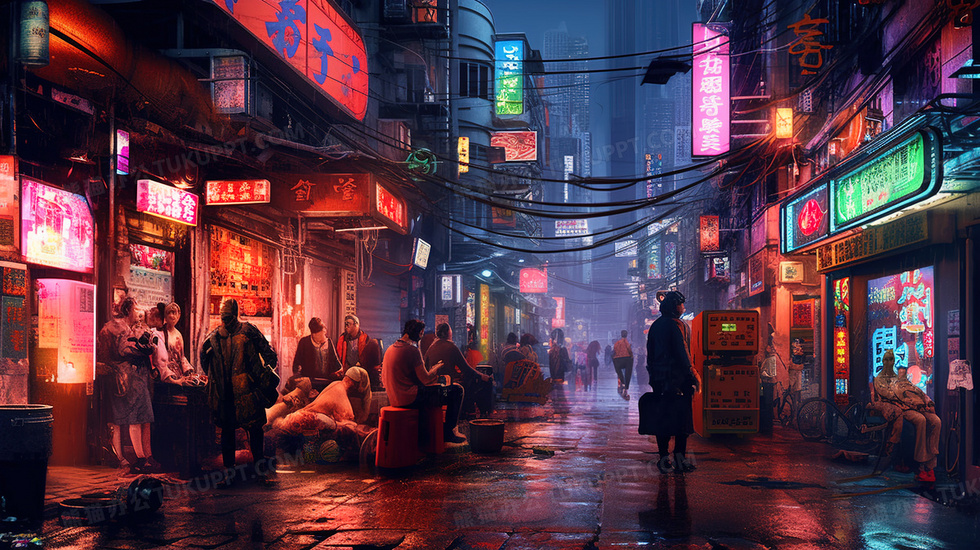 本作品内容为彩色赛博朋克风城市街景, 格式为 jpg, 大小7 MB, 图片尺寸为2912 x 1632, 源文件无水印, 欢迎使用熊猫办公。 如认为平台内容涉嫌侵权,可通过邮件:tousu@tukuppt.com提出书面通知,我们将及时处理。