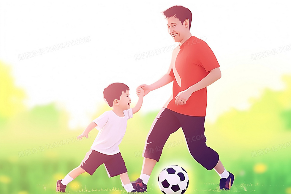 本作品内容为卡通爸爸在陪儿子踢足球, 格式为 jpg, 大小2 MB, 图片尺寸为2688 x 1792, 源文件无水印, 欢迎使用熊猫办公。 如认为平台内容涉嫌侵权,可通过邮件:tousu@tukuppt.com提出书面通知,我们将及时处理。