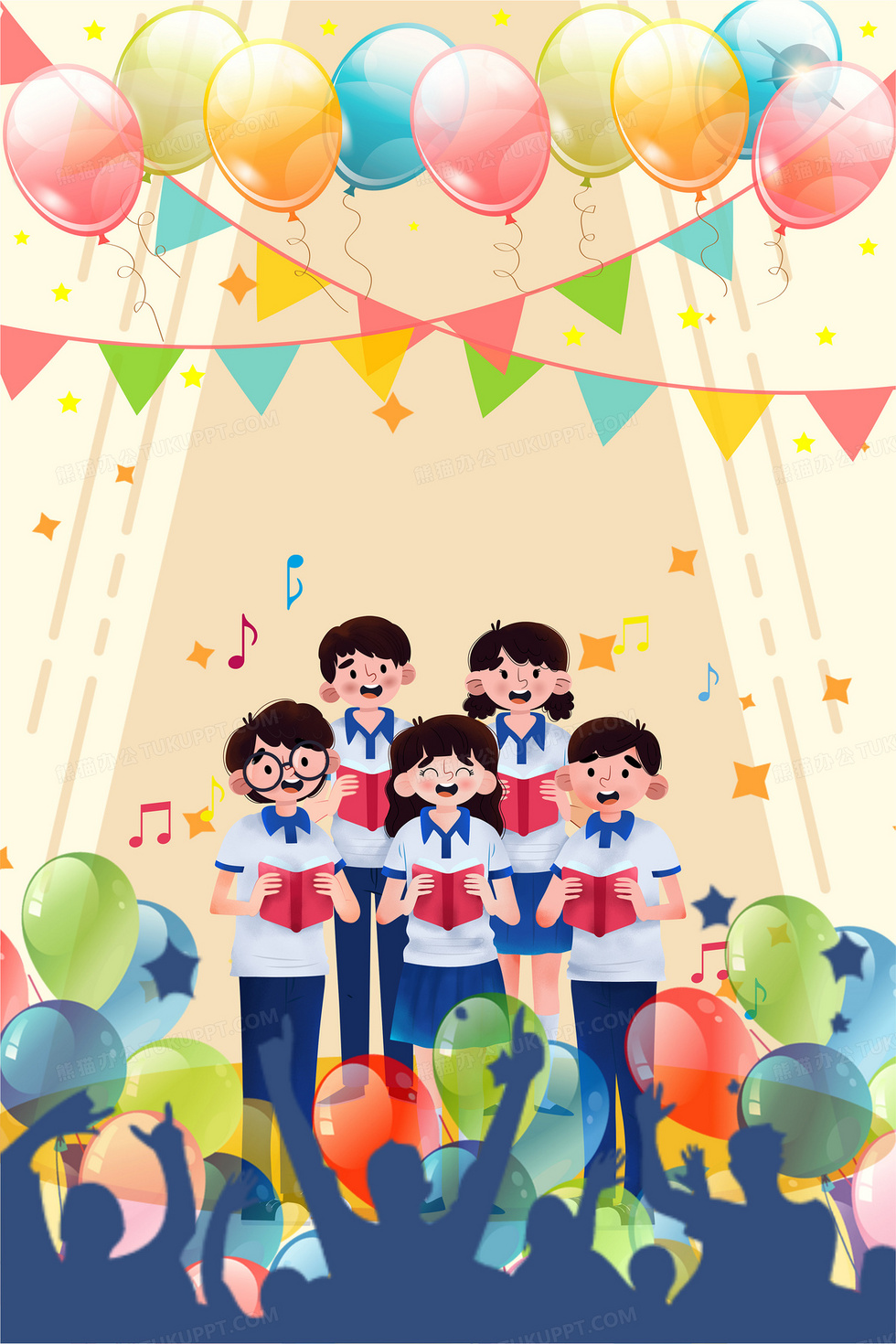 本作品内容为卡通风欢乐合唱庆祝背景, 格式为 cdr, 大小12 MB, 图片尺寸为3543 x 5315, 作品中背景图片无需修改, 源文件无水印,可以直接使用, 欢迎使用熊猫办公。 如认为平台内容涉嫌侵权,可通过邮件:tousu@tukuppt.com提出书面通知,我们将及时处理。