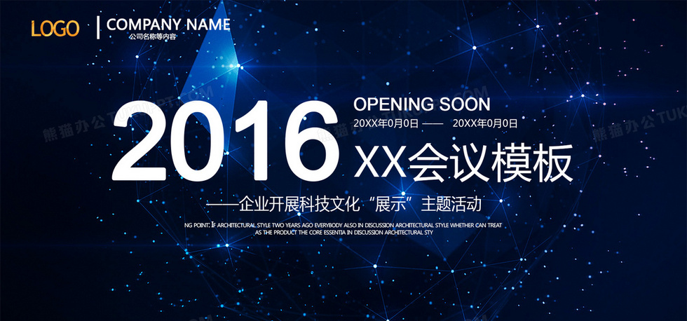 本作品内容为2016科技会议背景, 格式为 psd, 图片尺寸为1920 x 897, 作品中背景图片无需修改, 源文件无水印,可以直接使用, 欢迎使用熊猫办公。 如认为平台内容涉嫌侵权,可通过邮件:tousu@tukuppt.com提出书面通知,我们将及时处理。