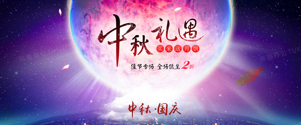 本作品内容为中秋国庆月亮促销活动背景banner, 格式为 psd, 图片尺寸为1920 x 800, 作品中背景图片无需修改, 源文件无水印,可以直接使用, 欢迎使用熊猫办公。 如认为平台内容涉嫌侵权,可通过邮件:tousu@tukuppt.com提出书面通知,我们将及时处理。