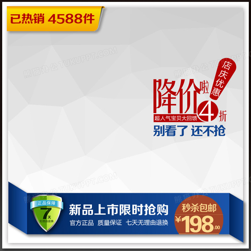 本作品内容为降价促销推广主图背景图, 格式为 psd, 图片尺寸为800 x 800, 作品中背景图片无需修改, 源文件无水印,可以直接使用, 欢迎使用熊猫办公。 如认为平台内容涉嫌侵权,可通过邮件:tousu@tukuppt.com提出书面通知,我们将及时处理。