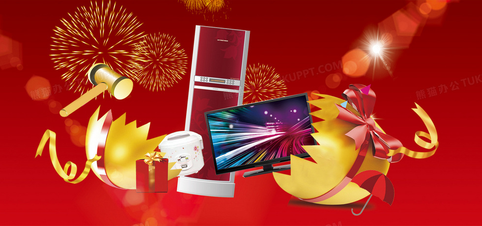 本作品内容为红色华丽家电促销背景, 格式为 psd, 图片尺寸为1921 x 900, 作品中背景图片无需修改, 源文件无水印,可以直接使用, 欢迎使用熊猫办公。 如认为平台内容涉嫌侵权,可通过邮件:tousu@tukuppt.com提出书面通知,我们将及时处理。
